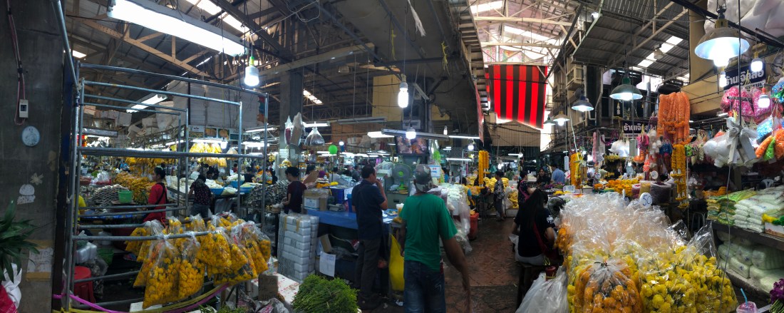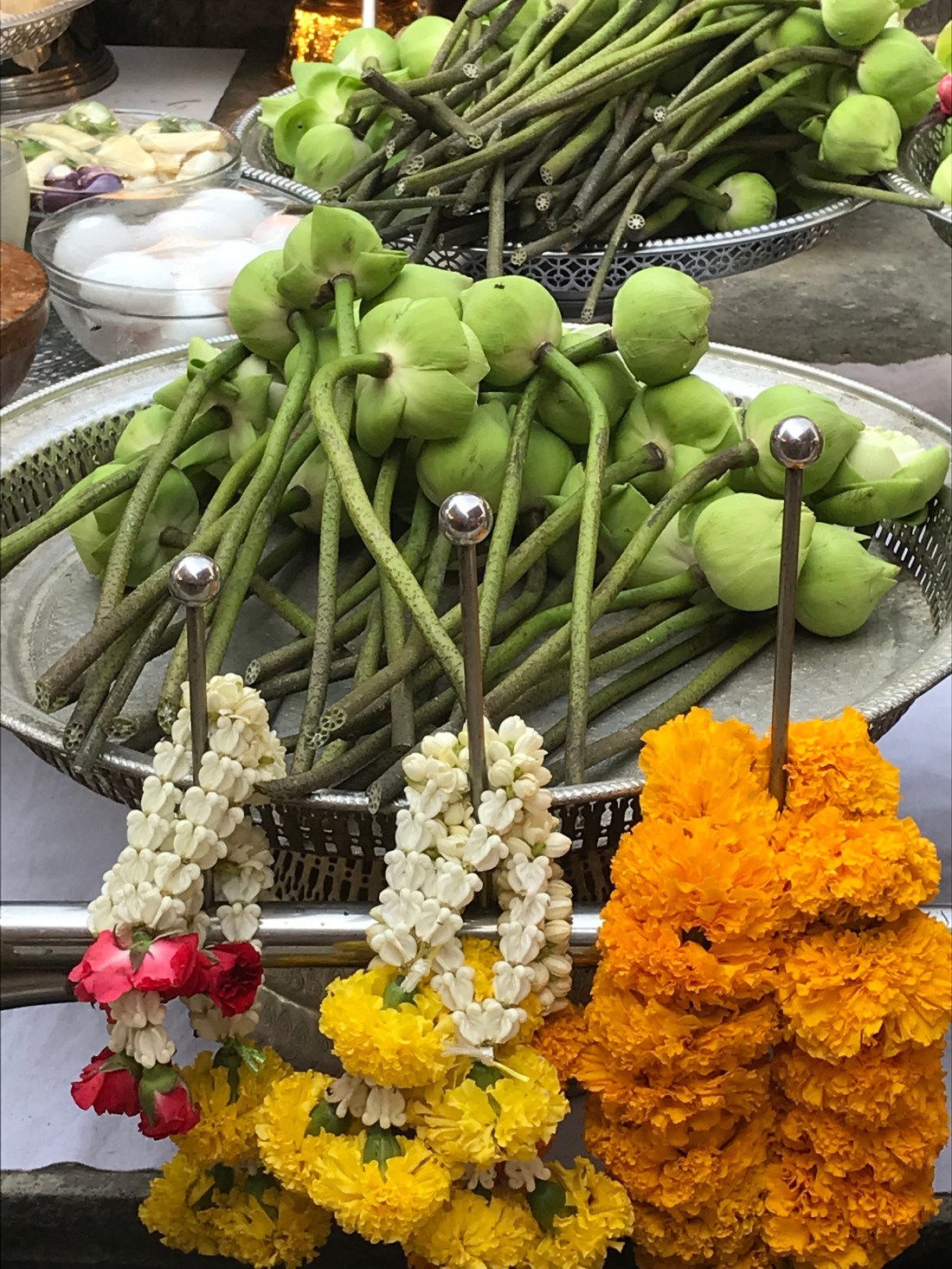 Ci dirigiamo poi al mercato dei fiori, un mercato mai visto prima, pieno di banchetti che non vendono fiori decorativi ma solo composizioni e ghirlande votive da offrire al tempio. Le giovani ragazze che le costruiscono sono estremamente abili e intrecciano corone alla velocità della luce.