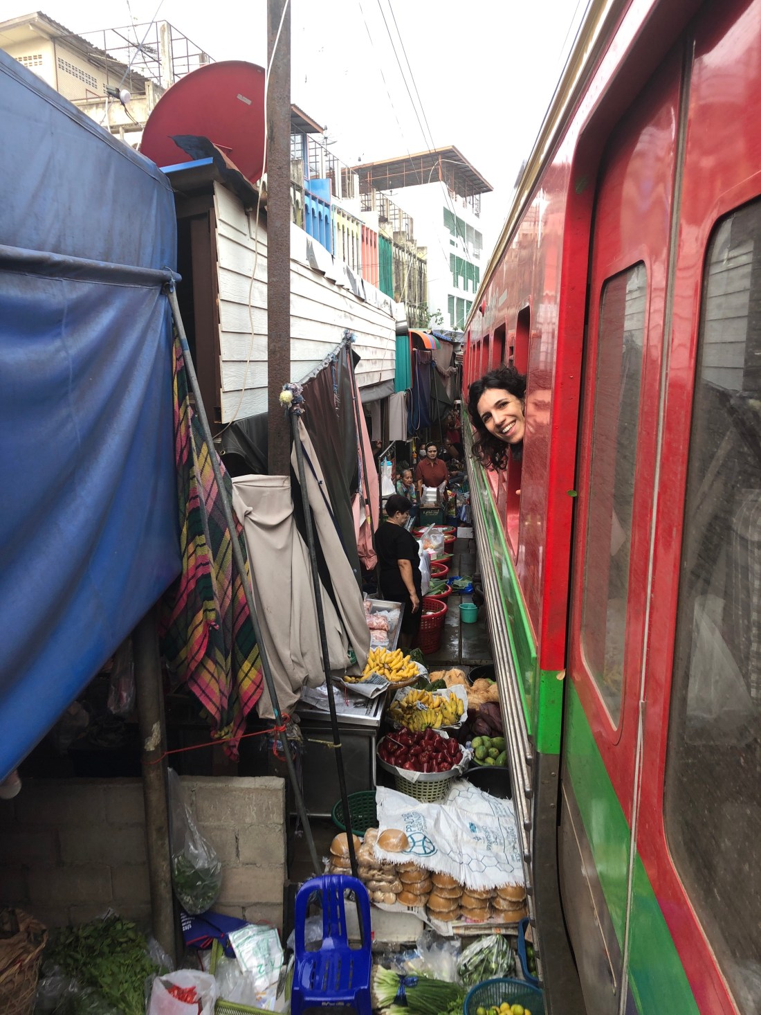 Il treno arriva qui al capolinea, scendiamo e scopriamo la vita di questo mercato: i banchetti con le merci sono appoggiati sopra i binari del treno, le tende parasole li ricoprono totalmente quindi, qualche minuto prima del passaggio del treno, inizia un’attività frenetica per spostare tutti i banchetti, tenere a mano le tende tirate sopra la testa e far passare il treno. Molti mercanti lasciano addirittura i cesti più bassi contenenti pesci e frutta attaccati alle rotaie il treno ci passa sopra senza bisogno di spostarli. Il fatto poi che il treno coli acqua e olio sulla merce non sembra preoccuparli assolutamente…io preferisco non pensare che in qualche ristorantino mangerò quelle cose!