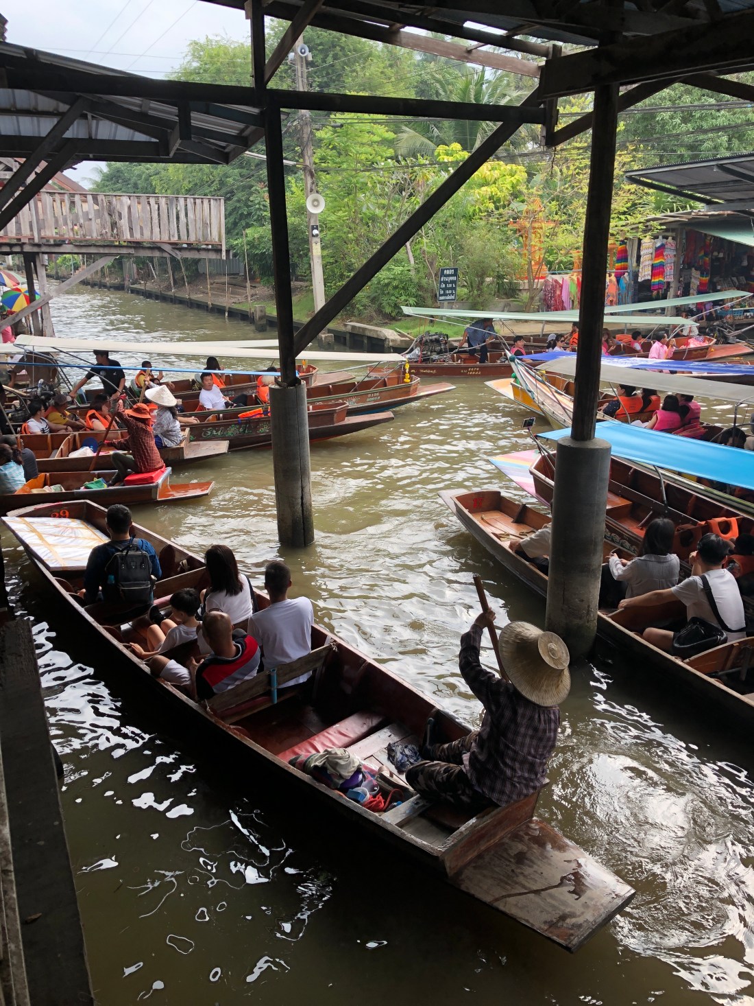 Dopo mezz’ora il treno riparte in direzione opposta, il teatrino si ripete e noi ripartiamo con il pulmino in direzione del mercato galleggiante di Dumnoen Saduak.