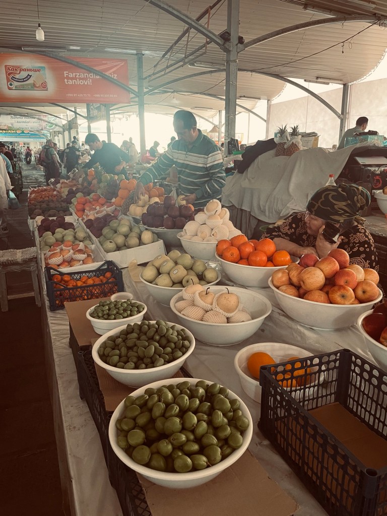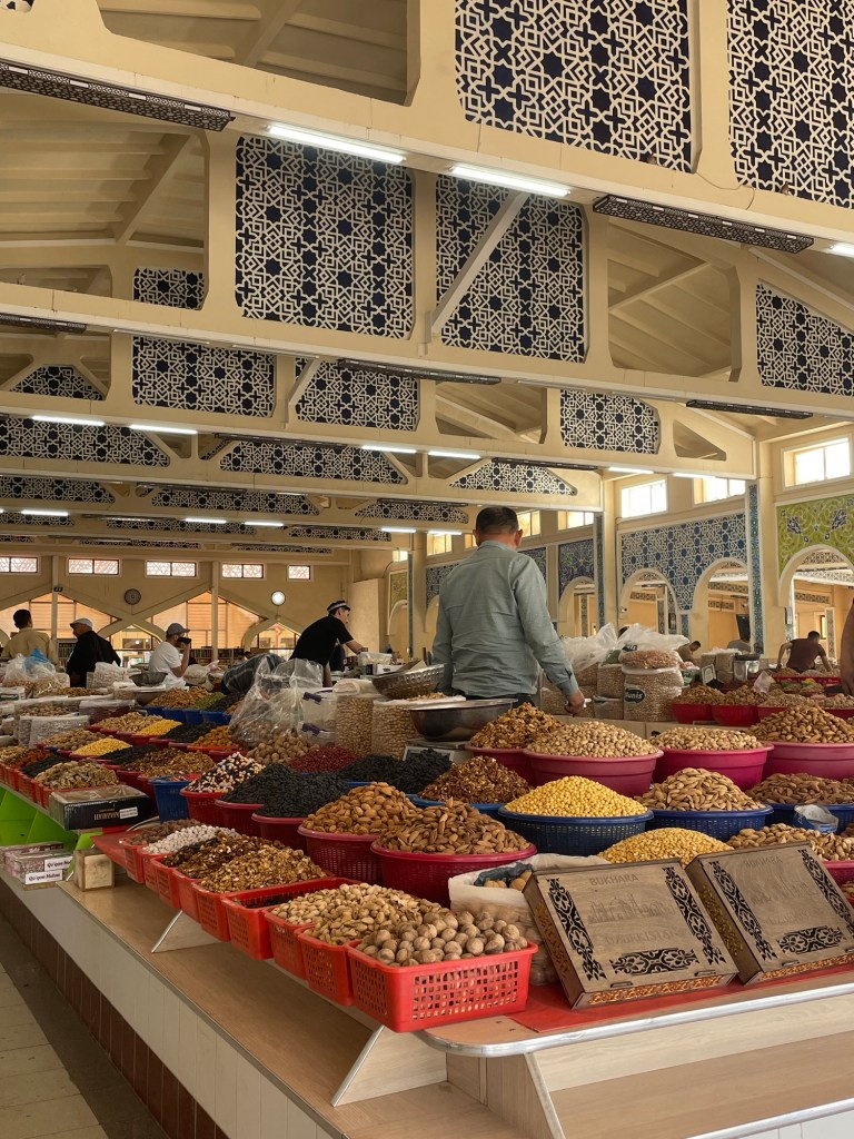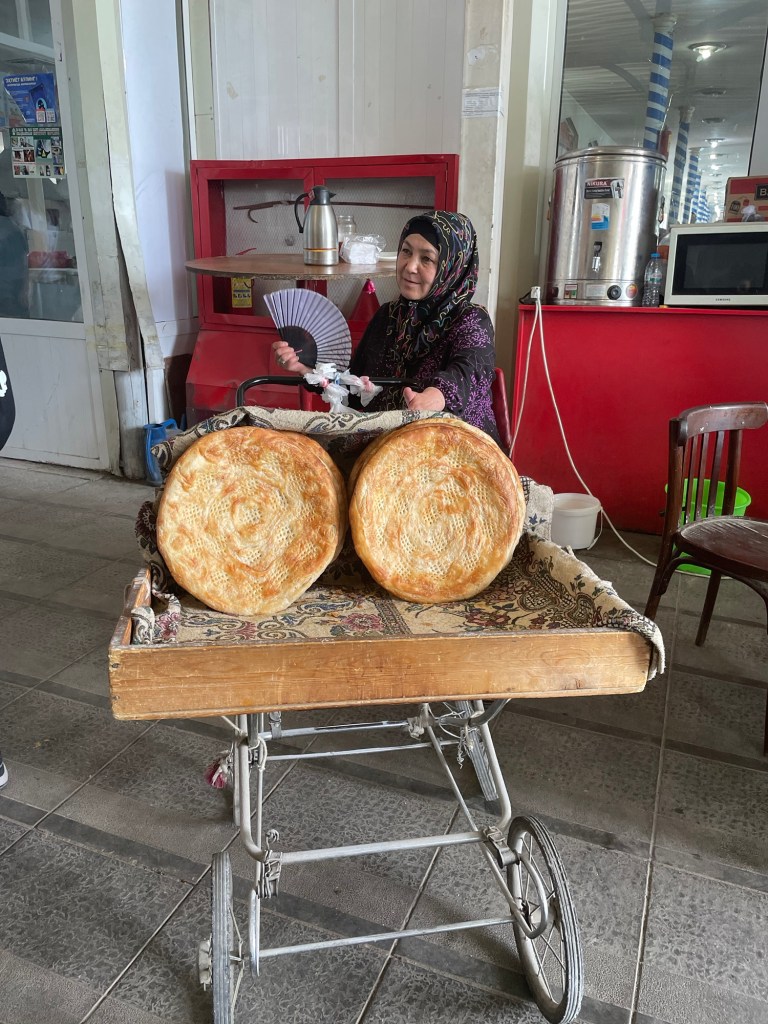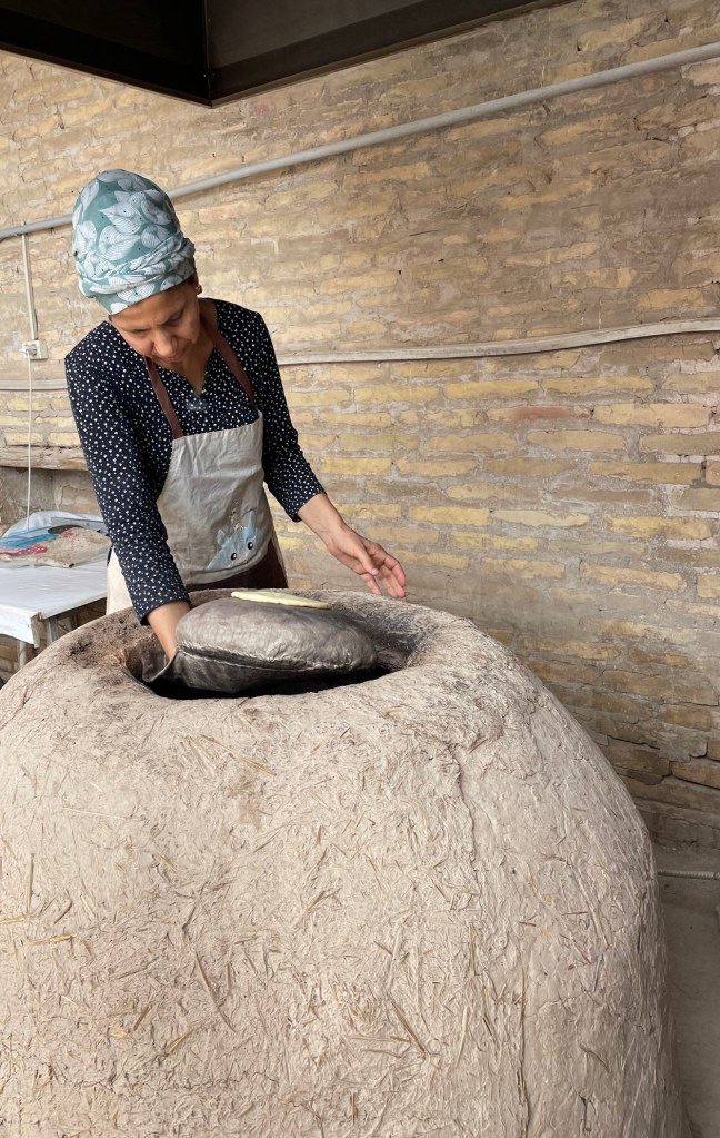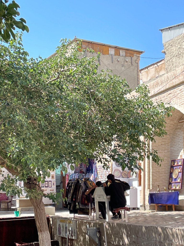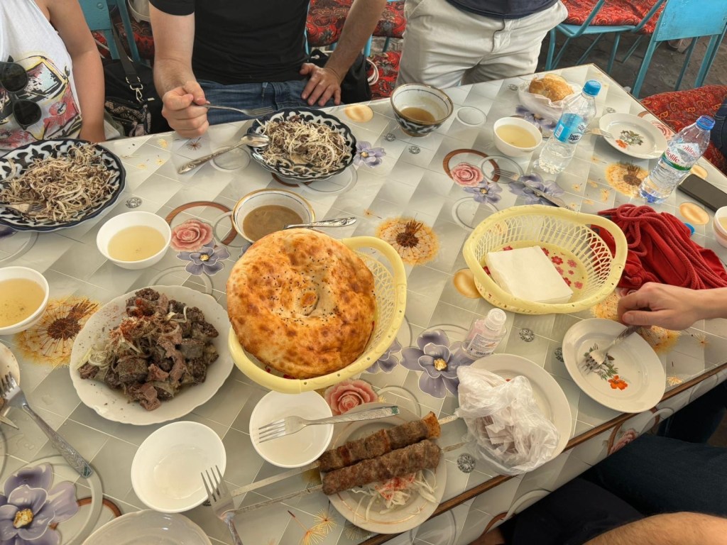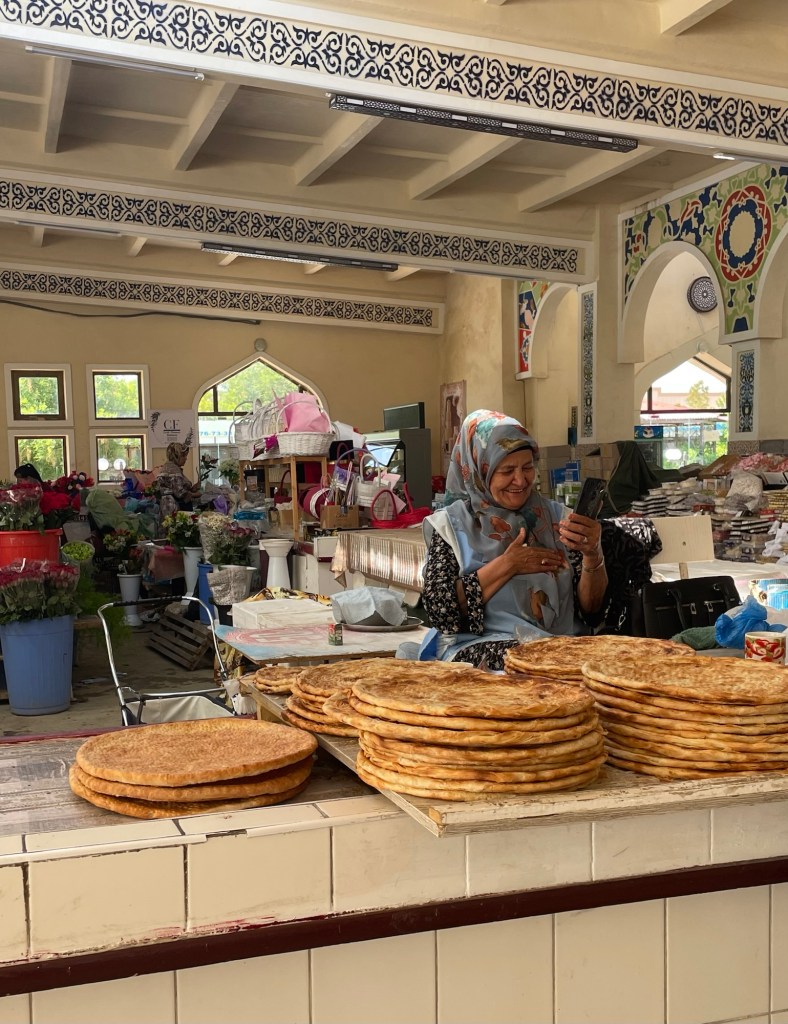 Ci fermiamo per pranzo e per un giretto al Bazar. La qualità dei souvenir non è un gran che ma mangiamo un buon pane sfogliato. In realtà è tutto quello che riusciamo a mangiare perché lo street food in Uzbekistan non è per niente sviluppato (l’unica cosa che si trova a volte sono i samsa, delle specie di fagottini di pasta ripieni di carne).