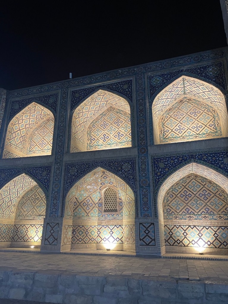 Andiamo poi alla piazza Registan. Il nome significa sabbia rossa, in quanto si dice che qui tagliassero le dita a chi commetteva reati quali furti.