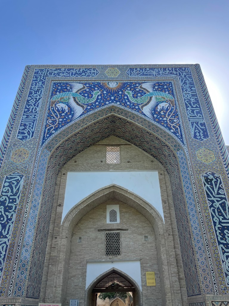 La madrasa di Ulugh Beg è la più antica e risale al regno timuride (1420). Nella madrasa Tilya-Kori (che significa “dorata”), risalente al 1660, vi è anche una grande moschea, appunto dorata. Sulla facciata della madrasa Sher-Dor, del 1636, sono rappresentate delle tigri, scelta molto interessante dal momento che viola il divieto nell’Islam di raffigurare esseri viventi sugli edifici religiosi.
